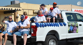 Krista Lara (in back) and her husband Johnny (driving) set up a table for